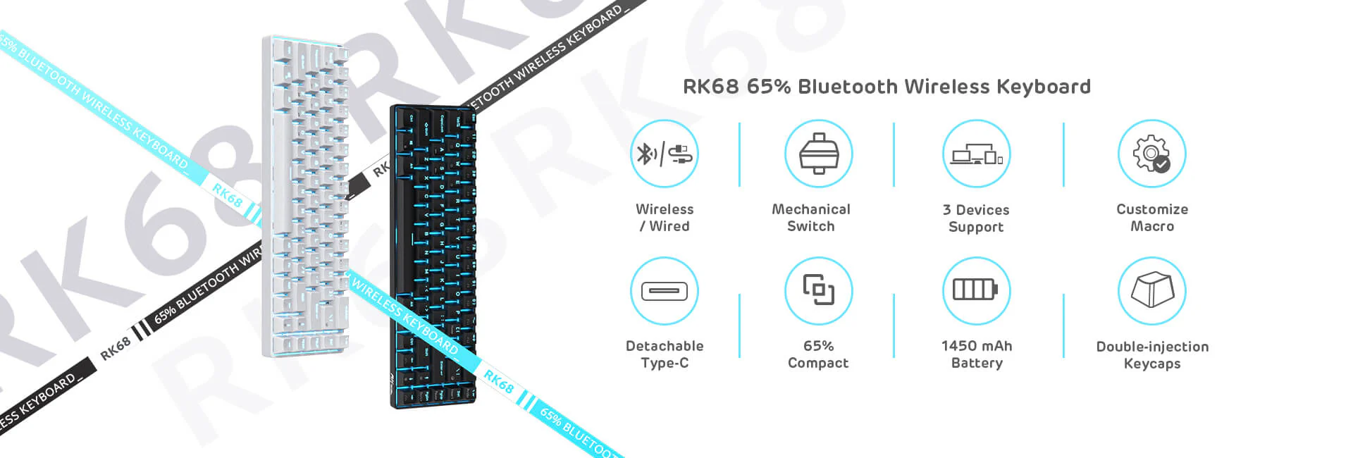RK68 boasts both practical and compact features while retaining a minimalist layout and it also geared with arrow keys and frequently used control keys.