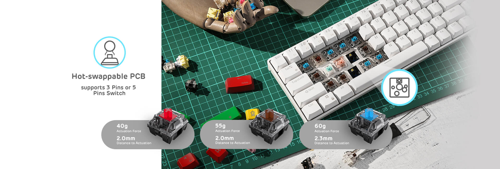 65% compact designed layout with individual arrow keys and control keys, which is a huge optimization of 60% and 70% layout. Still compact size with more friendly and easier command input.