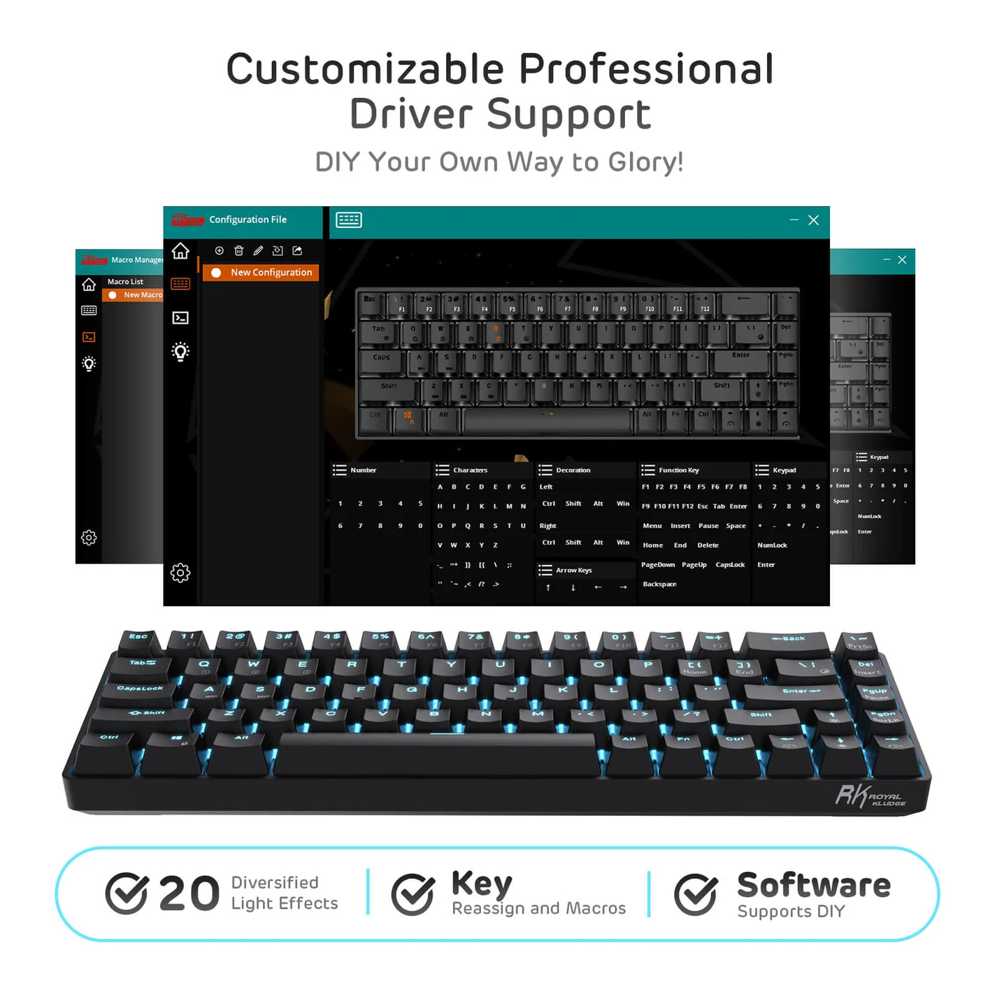 Even if RK68 has no multicolored RGB but only blue LED backlit, the 20 dynamic backlit modes will hype your gaming set a unique style. Use FN + to choose your ideal mode, adjust the brightness and glowing speed freely. Get some lights on to take your blues away and make your day.