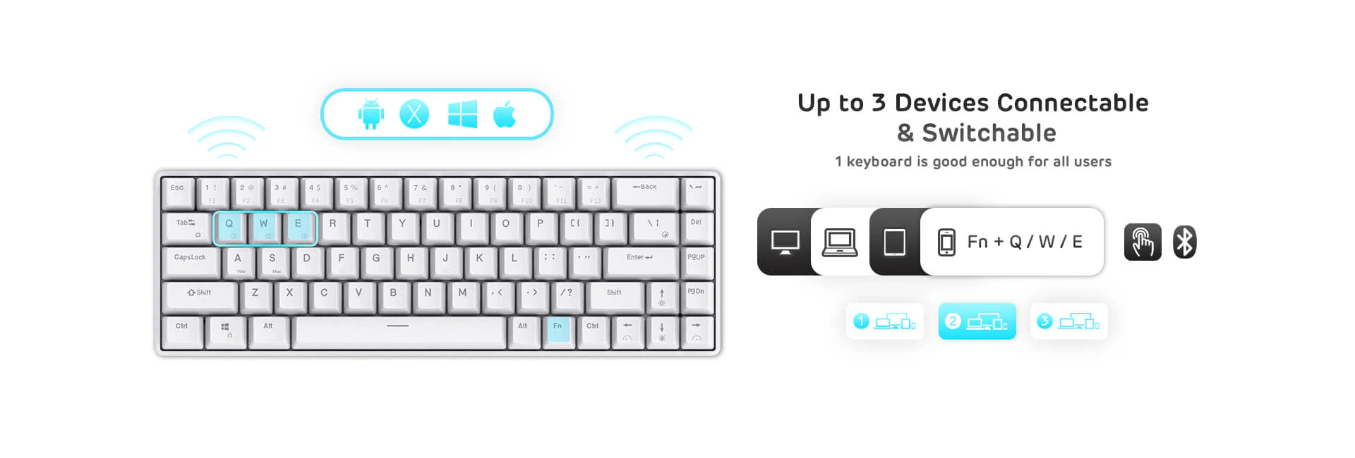 Easily 5 different devices switchable with FN + Q/W/E/R/T in wireless mode