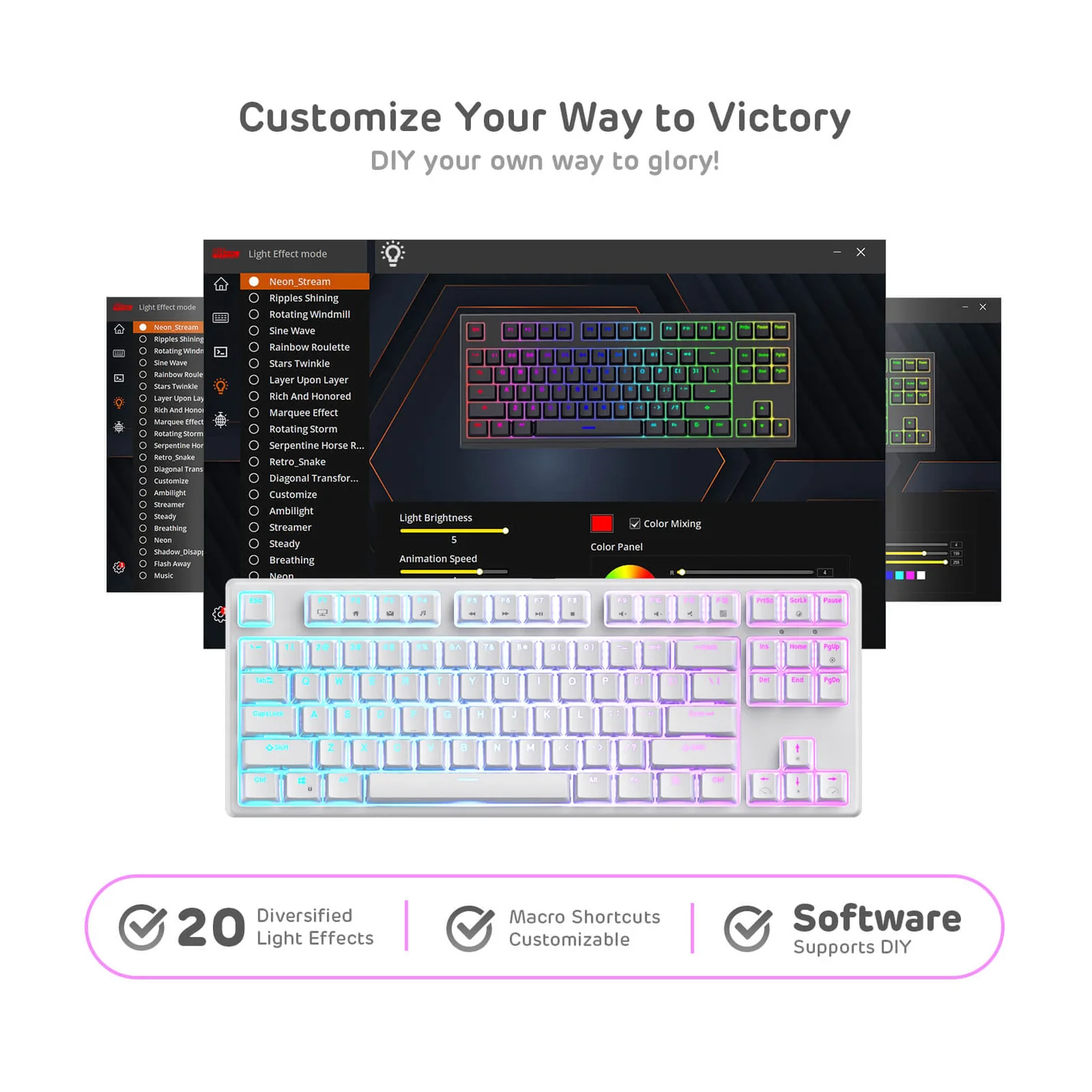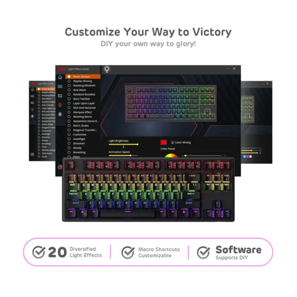 80% compact TKL layout saves more mouse movement space for FPS gamers. 15.3 x 5.4 inches size plus 1.1kg lightweight frame offers more desk space for other devices and easy carrying with while on business travel.